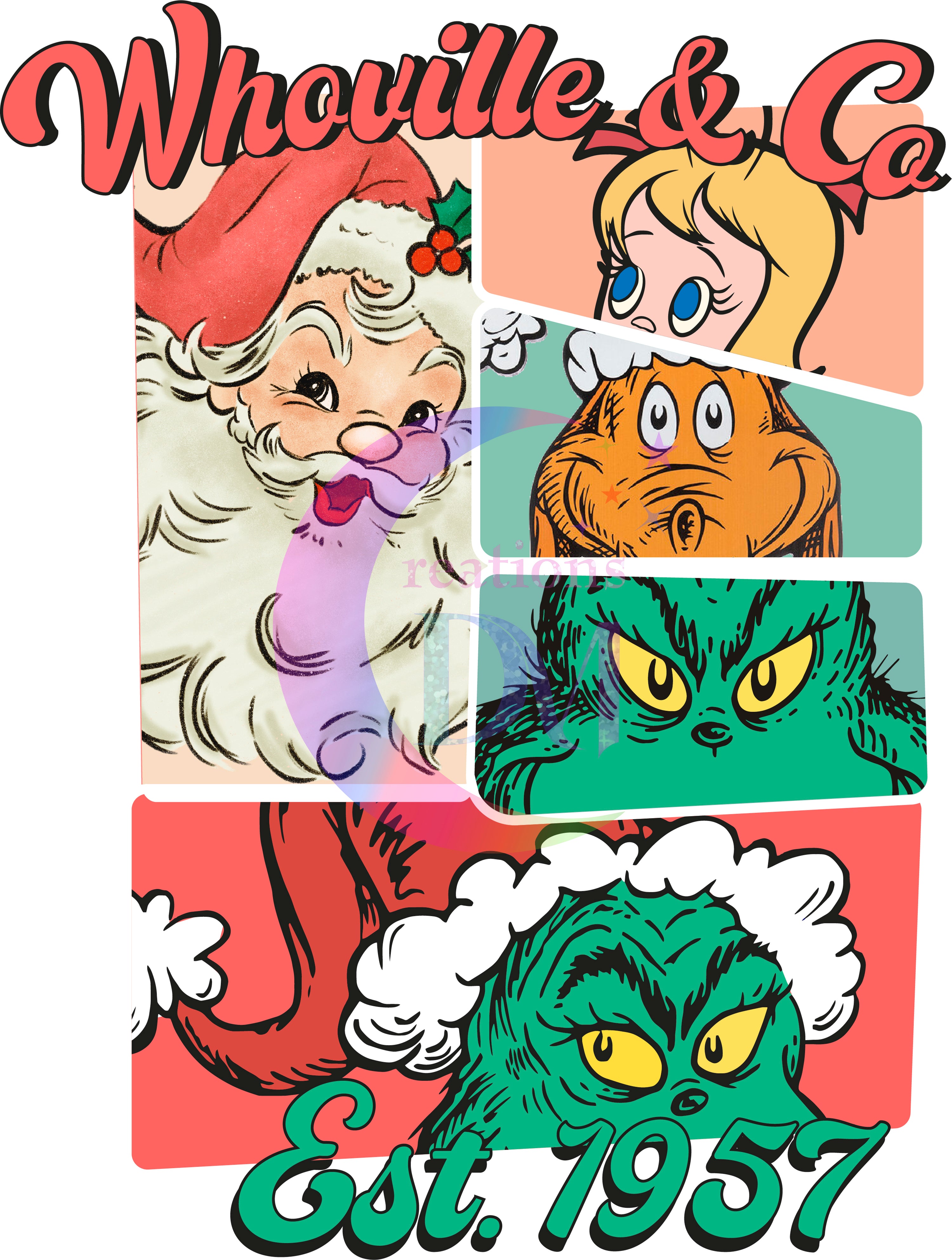 Christmas DTF - grinch - whoville and co , est 1957 , santa and friends