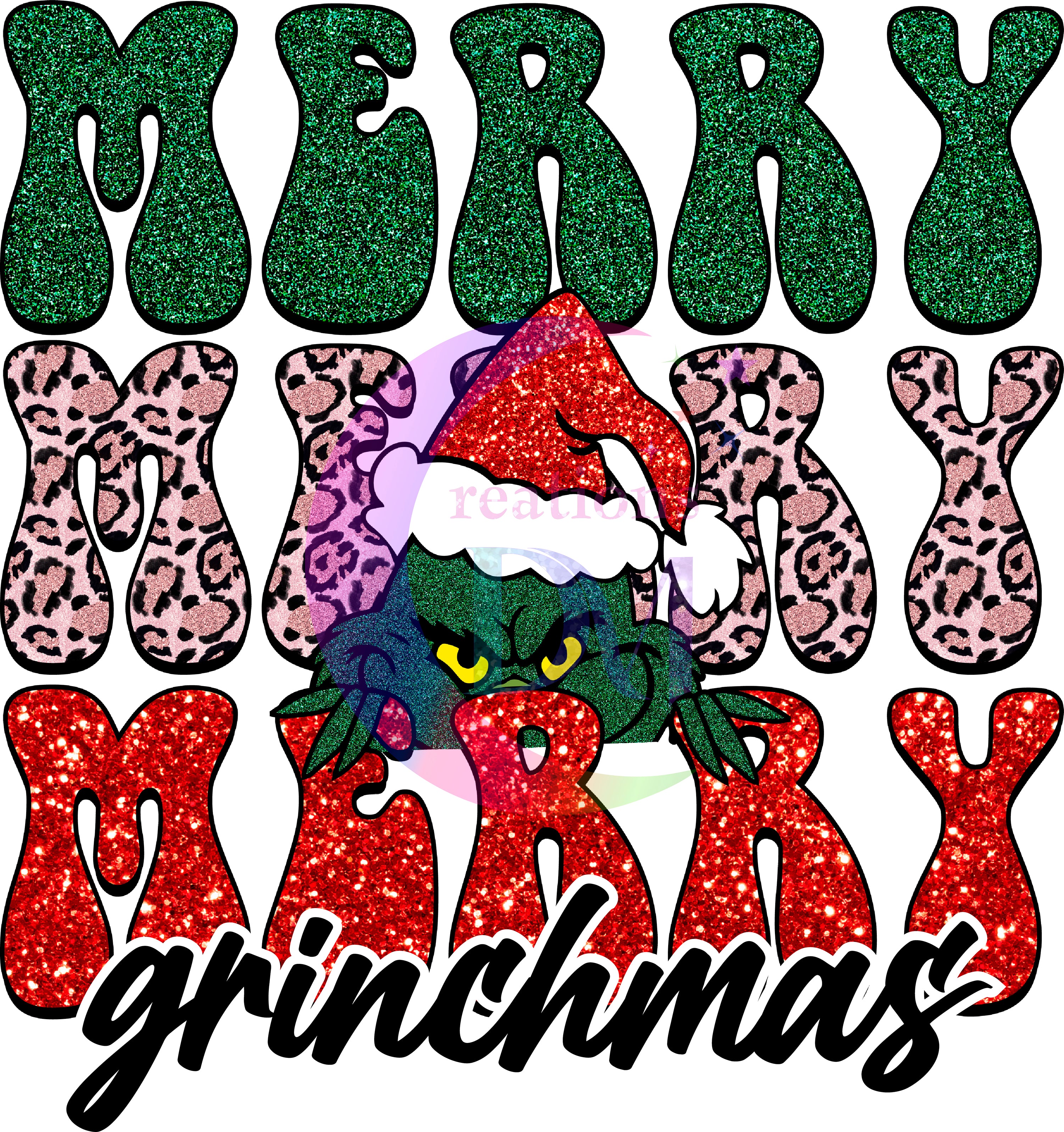Christmas DTF - merry , merry merry grinhcmas , green , red glitter , leopard print