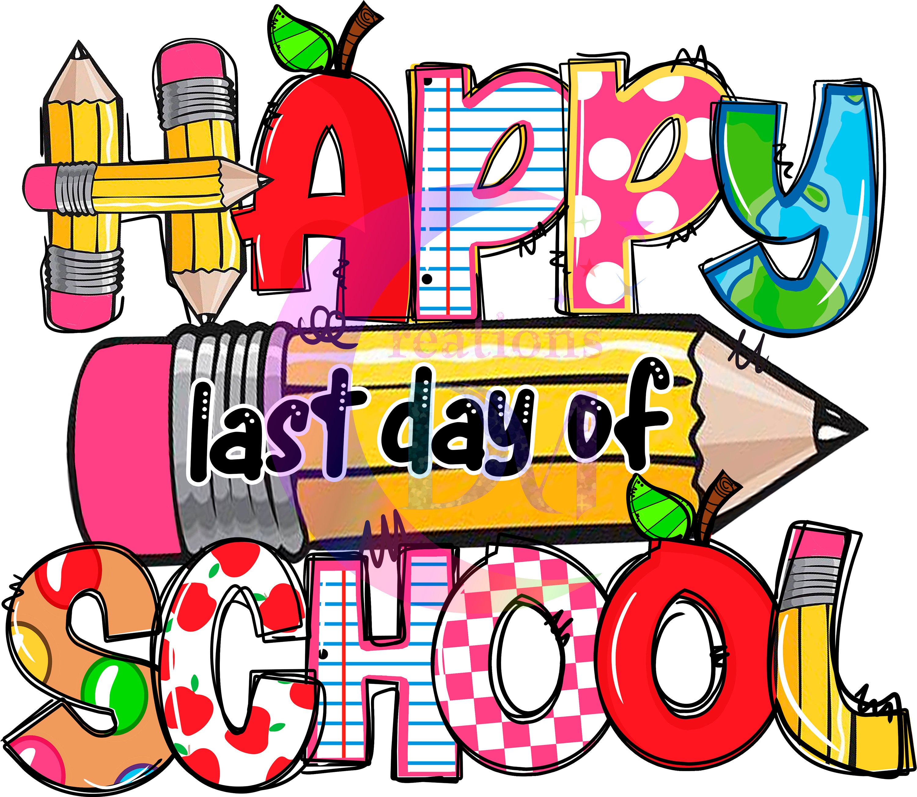 last day of school DTF - happy last day of school red , blue and orange letter pencil -stars & apple